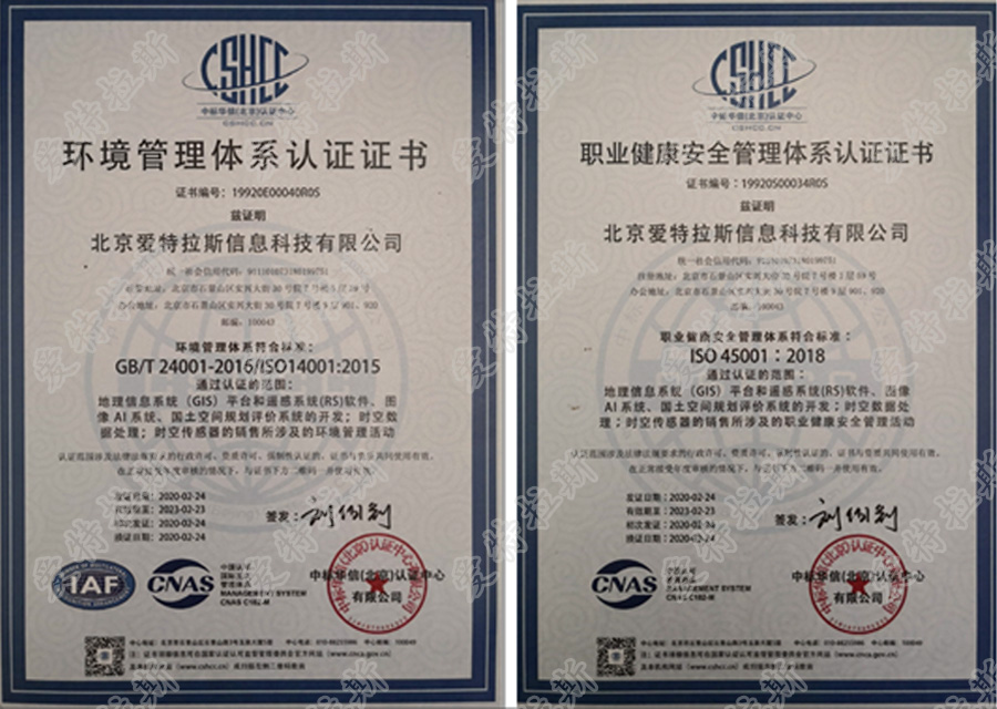 一直以來(lái),ATLAS全面貫徹“全生命周期管理、全過(guò)程質(zhì)量控制、全方位顧客滿(mǎn)意、全領(lǐng)域持續改進(jìn)”的質(zhì)量方針,不斷提升管理,為客戶(hù)提供優(yōu)質(zhì)的產(chǎn)品和服務(wù)。公司持續整合與完善各體系,陸續通過(guò)了的ISO9001質(zhì)量管理體系、ISO14001環(huán)境管理體系、IOS45001:2018職業(yè)健康安全管理體系認證。堅持評估企業(yè)和產(chǎn)品的風(fēng)險與機會(huì ),努力降低企業(yè)經(jīng)營(yíng)活動(dòng)的各種風(fēng)險,為企業(yè)可持續發(fā)展建立長(cháng)效機制。我們視環(huán)境管理以及職業(yè)健康管理為我們業(yè)務(wù)管理中不可或缺的部分,通過(guò)有效的管理系統、保障投入和持續改善,贏(yíng)得員工、客戶(hù)、股東和社會(huì )的信任,成為一流的基于遙感大數據的人工智能企業(yè)。