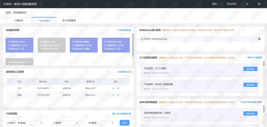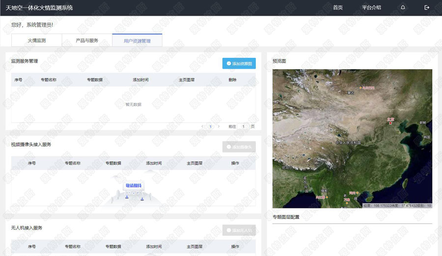 本平臺根據 《“十四五”林業(yè)草原保護發(fā)展規劃綱要》中的“林業(yè)生態(tài)監測”需求,結合使用靜止衛星打造出“天空地一體化火情監測預警平臺”,下圖為平臺主要界面。