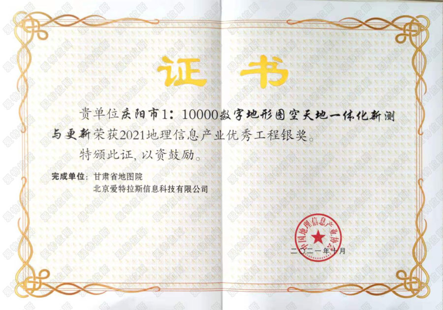 二零二一年十月,經(jīng)過(guò)中國地理信息產(chǎn)業(yè)協(xié)會(huì )嚴格評選,我公司參與項目《慶陽(yáng)市1:10000數字地形圖空天地一體化新測與更新》項目榮獲2021地理信息產(chǎn)業(yè)優(yōu)秀工程銀獎,我司總經(jīng)理為該項目獲獎?wù)咧弧?/span>