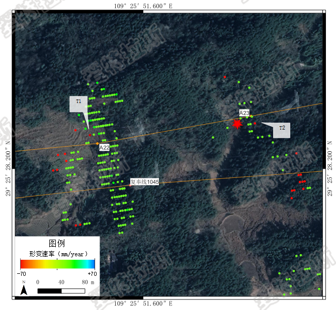 利用獲取的奉復、錦蘇線(xiàn)湖南部分區域 2019 年 1 月至 2021 年 11 月的中分辨率合成孔徑雷達序列影像,通過(guò) Stacking InSAR、PSInSAR 和 SBASInSAR技術(shù),對周邊地區該時(shí)間內的地表形變信息進(jìn)行普查。獲得在研究區域內獲得了大量的地表形變監測點(diǎn),在監測區域發(fā)現多處地質(zhì)形變區域,在輸電線(xiàn)塔周?chē)舶l(fā)現明顯形變區。在研究區域內發(fā)現多處形變異常點(diǎn),達到了輸電線(xiàn)塔地質(zhì)沉降普查的目的。