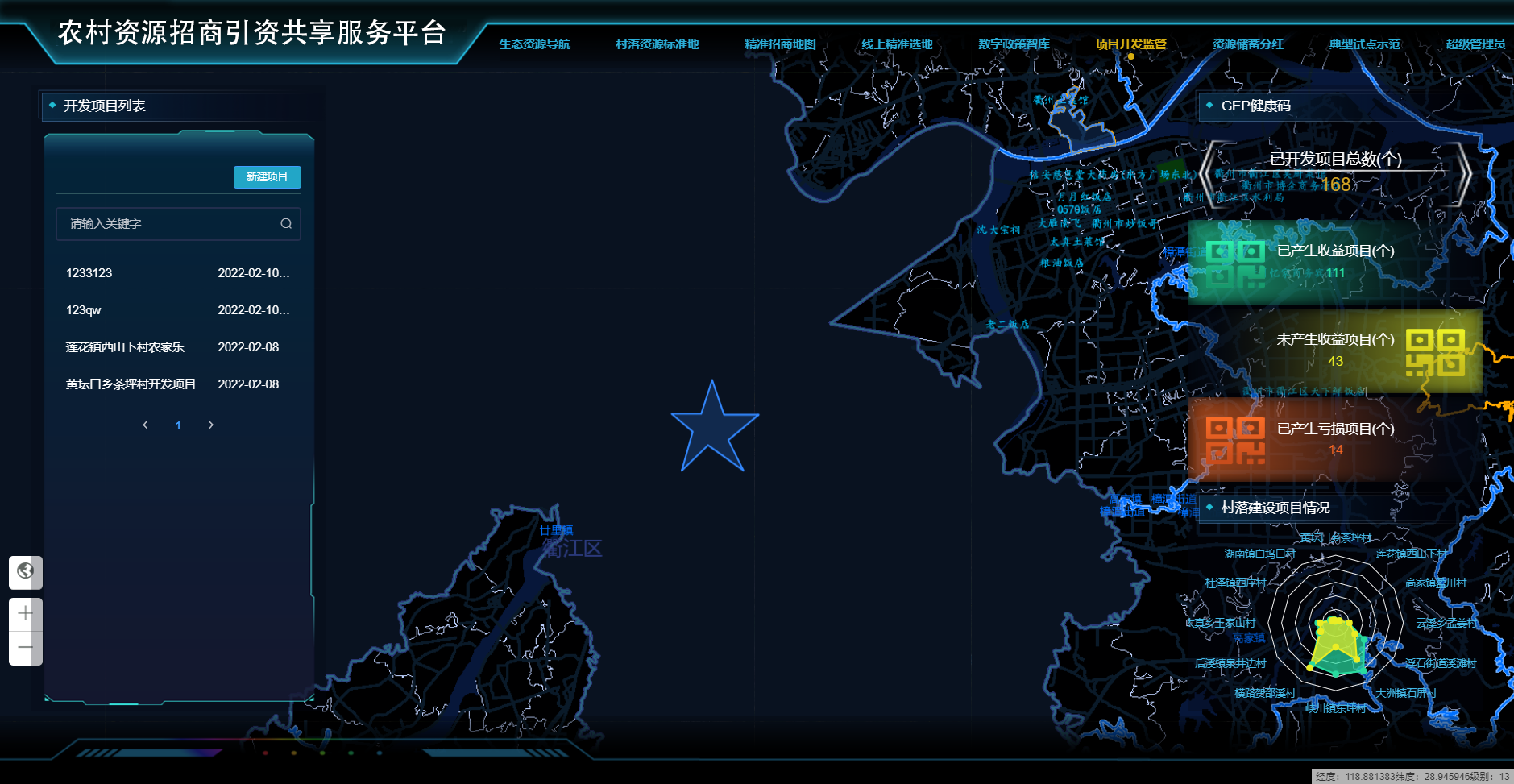 項目開(kāi)發(fā)監管模塊:項目開(kāi)發(fā)監管功能模塊是對已經(jīng)落地的項目進(jìn)行持續、高頻的生態(tài)價(jià)值核算監管與開(kāi)發(fā)監管,確保項目落地與生態(tài)價(jià)值協(xié)同發(fā)展,全流程監管項目開(kāi)發(fā)進(jìn)度。主要包括重點(diǎn)項目歸檔、村落級GEP動(dòng)態(tài)監管、以及項目進(jìn)度監管等。