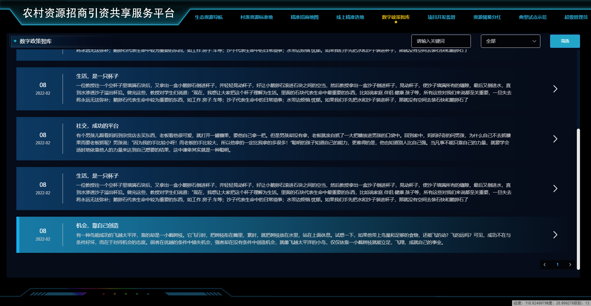 數字政策智庫模塊:本模塊主要建設數字智庫,實(shí)現相關(guān)政策的推送、解讀、對接。例如村落村落資源儲蓄政策、村落資源標準地建設政策、項目開(kāi)發(fā)落地政策、金融支持政策等。
