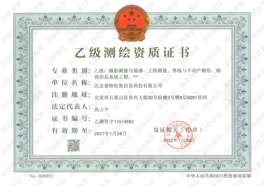 2022虎年剛剛開(kāi)工,喜訊傳來(lái),愛(ài)特拉斯收到了由北京市規劃和自然資源委員會(huì )頒發(fā)的乙級測繪資質(zhì)證書(shū)。資質(zhì)證書(shū)的專(zhuān)業(yè)類(lèi)別包括攝影測量與遙感、工程測量、界線(xiàn)與不動(dòng)產(chǎn)測繪、地理信息系統工程等方面。