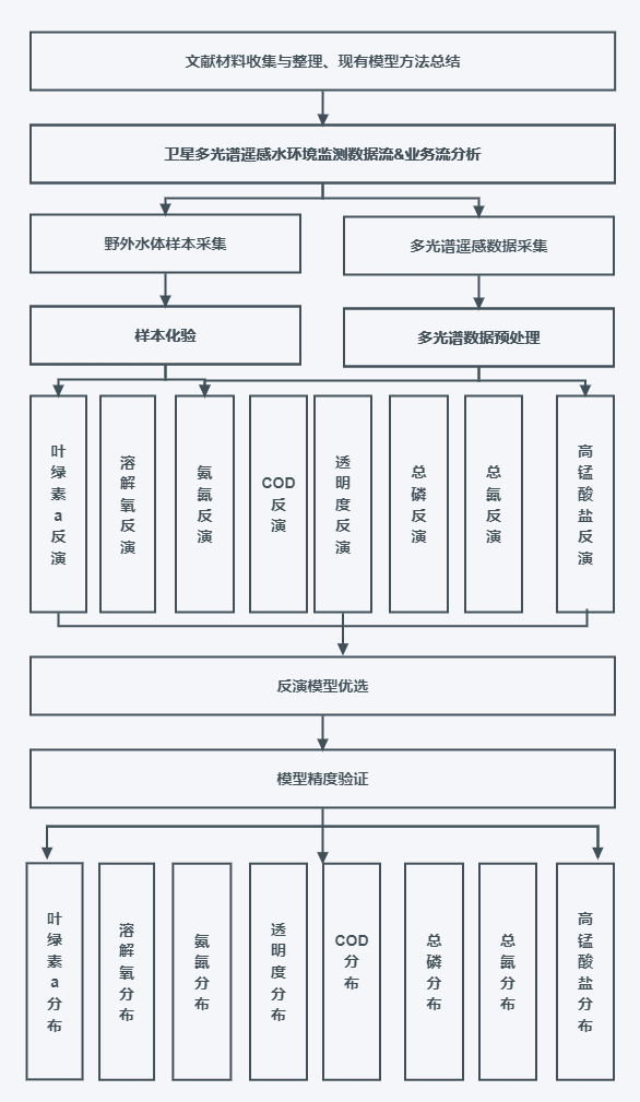 水反演產(chǎn)品水質(zhì)遙感監測主要采用遙感+GIS技術(shù),通過(guò)遙感影像預處理,結合水質(zhì)監測數據、野外調查實(shí)測數據、河流分布數據等輔助數據,建立研究區水體水質(zhì)解譯樣本,反演水質(zhì)參數,同時(shí)對反演的結果進(jìn)行分類(lèi)定級,結合野外實(shí)測數據對結果進(jìn)行驗證,并生成相應的統計分析報告。技術(shù)路線(xiàn)如下所示: