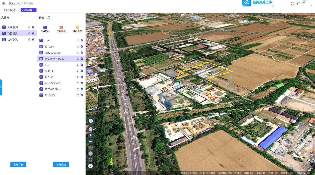 巡航管理模塊為無(wú)人機飛行任務(wù)提供全流程管控,涵蓋航線(xiàn)管理、任務(wù)管理和禁飛區管理三大功能。航線(xiàn)管理支持新增、導入或手動(dòng)繪制航線(xiàn),可精細化設置飛行高度、速度、攝像頭角度及任務(wù)完成動(dòng)作;任務(wù)管理允許用戶(hù)定義任務(wù)名稱(chēng)、選擇航線(xiàn)、指定設備、設定執行策略與時(shí)間,無(wú)人機按預設要求自動(dòng)執行巡航任務(wù);禁飛區管理支持導入或手動(dòng)繪制禁飛區域,確保無(wú)人機飛行過(guò)程中自動(dòng)規避敏感地帶,保障飛行安全與合規。在與山東省國網(wǎng)電力的合作項目中,該模塊實(shí)現了輸電線(xiàn)路建設的過(guò)程監控、進(jìn)度跟蹤和環(huán)保預警,大幅提升了電力設施運維效率。