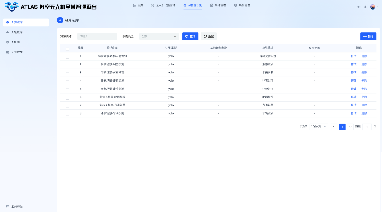AI識別模塊整合算法庫、場(chǎng)景庫、配置功能和識別結果管理四大子功能,構建起“算法—場(chǎng)景—設備—成果”的全鏈路閉環(huán)體系。算法庫實(shí)現對各類(lèi)識別算法的統一管理,支持算法新增、編輯、刪除與版本控制,涵蓋森林火情識別、水面異物檢測、非農化監測等十余類(lèi)核心算法;場(chǎng)景庫針對“五長(cháng)制”不同業(yè)務(wù)領(lǐng)域,預設適配的算法組合,支持場(chǎng)景描述維護、適用區域設定和識別閾值調整,實(shí)現“一場(chǎng)景一策略”的精細化識別;AI配置功能可將場(chǎng)景算法靈活綁定至指定無(wú)人機,設置巡檢范圍、頻次、靈敏度等參數,支持遠程下發(fā)與動(dòng)態(tài)更新;識別結果管理模塊對識別事件進(jìn)行結構化存儲,通過(guò)縮略圖預覽、高清圖像下載和地圖空間化展示,直觀(guān)呈現事件分布趨勢,聯(lián)動(dòng)事件管理模塊啟動(dòng)處置流程。